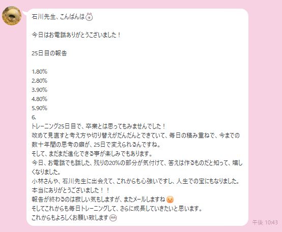 「数十年間の思考の癖が25日で変えられるんですね。」
